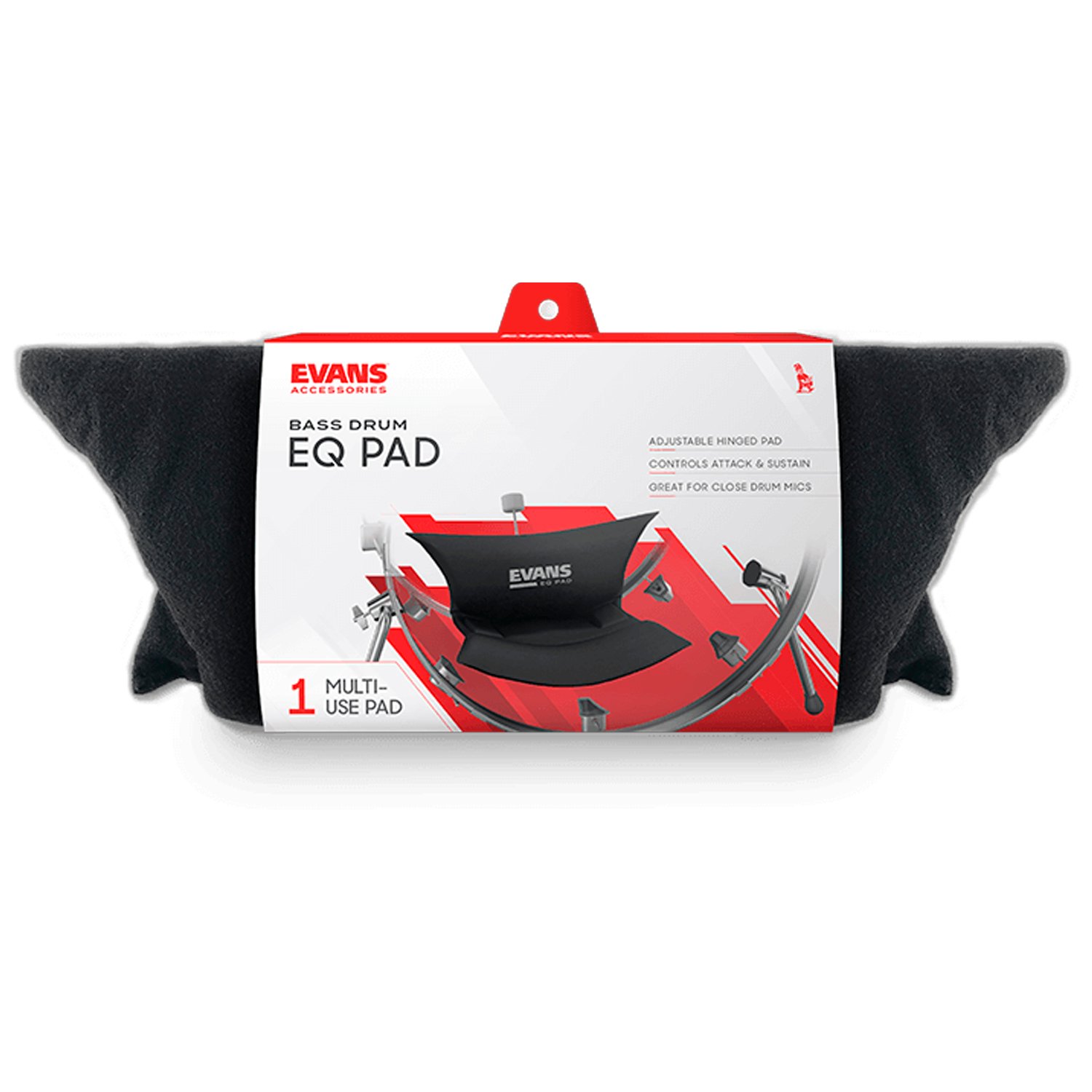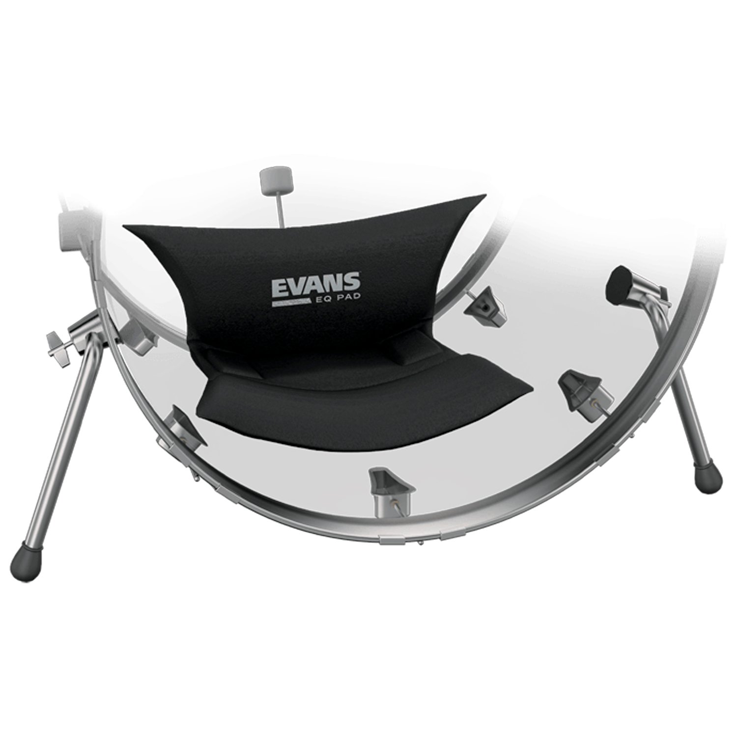 El EVANS EQ Pad es un silenciador de bombo de alta eficiencia que se fija a la parte inferior del casco con velcro. El pad, con bisagra, rebota contra el parche, lo que permite el sustain antes de amortiguar la vibración del parche.