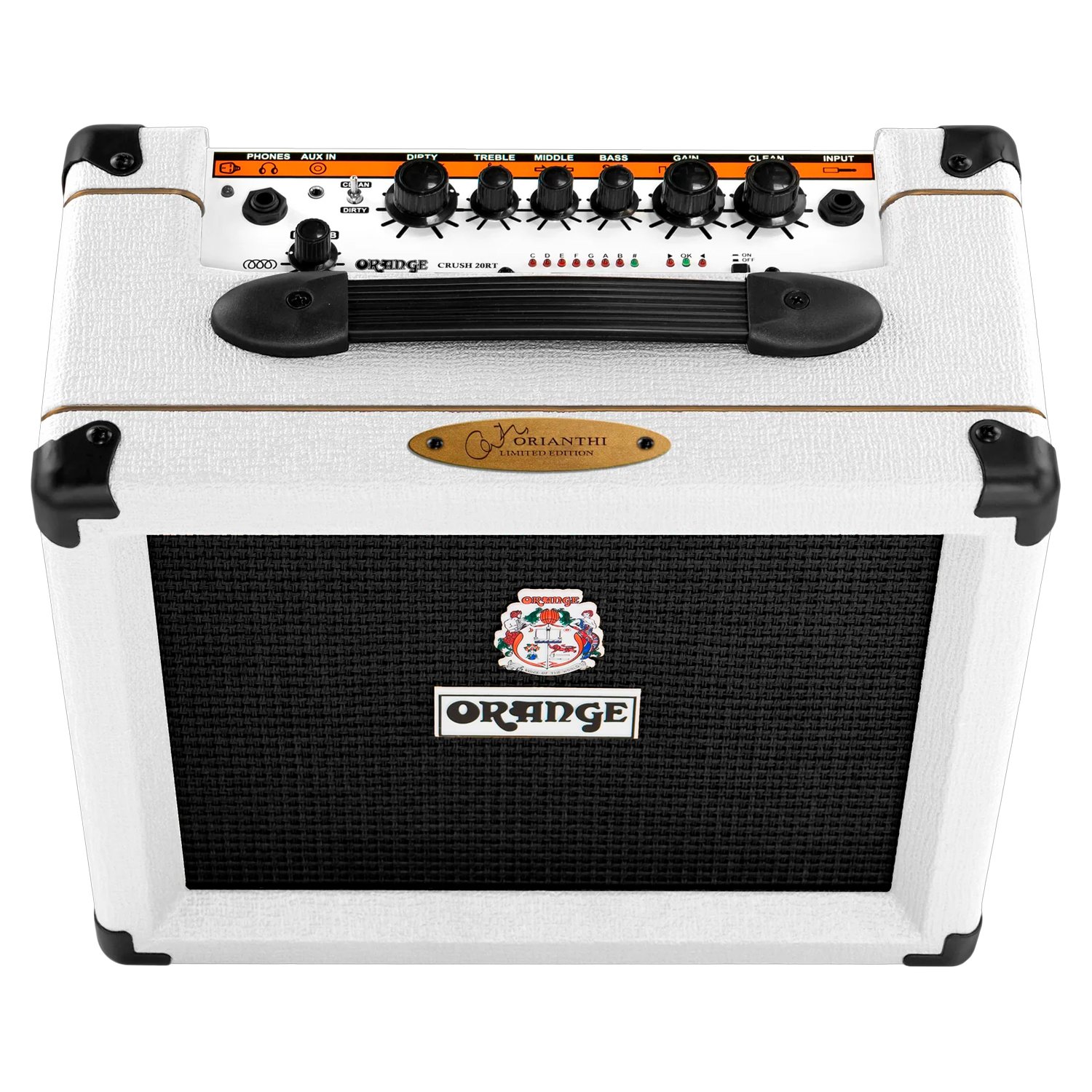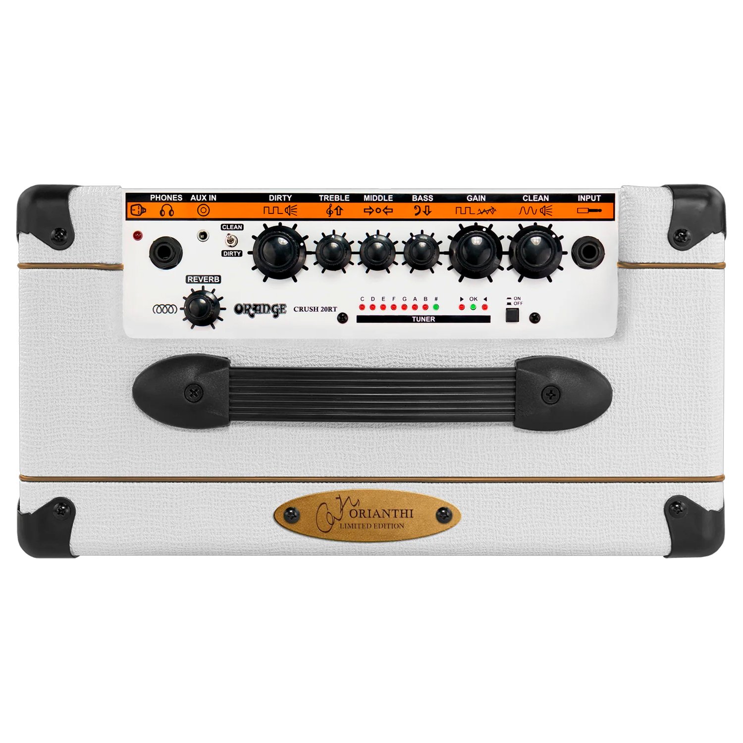 El Crush 20RT Orianthi Signature se basa en la exitosa fórmula del Crush 20, añadiendo una exuberante reverberación digital y un afinador cromático integrado, todo ello envuelto en un elegante tolex blanco en honor a la reina del estilo y el sonido, Orianthi. Este combo de 20 W es totalmente analógico y ofrece dos canales, Clean y Dirty, para cambiar fácilmente de tono mediante un pedal. Un potente ecualizador de tres bandas moldea tu sonido, mientras que nuestra salida de auriculares con simulación de cabina te permite practicar en silencio con un sonido de gran escenario. Tanto si estás calentando entre bastidores, grabando directamente o tocando en casa, el Crush 20RT ofrece el inconfundible sonido Orange en un formato práctico, compacto, asequible y listo para el escenario.