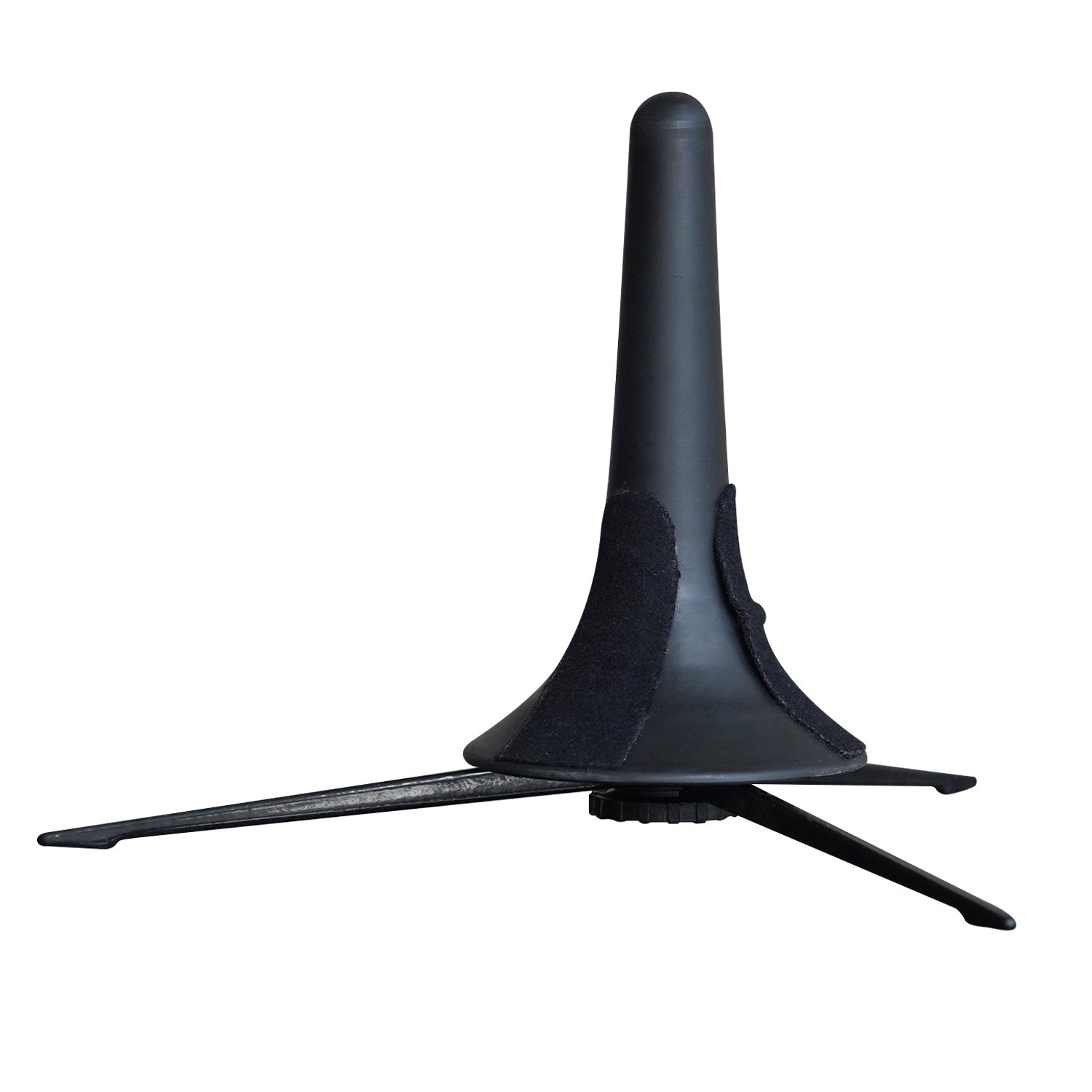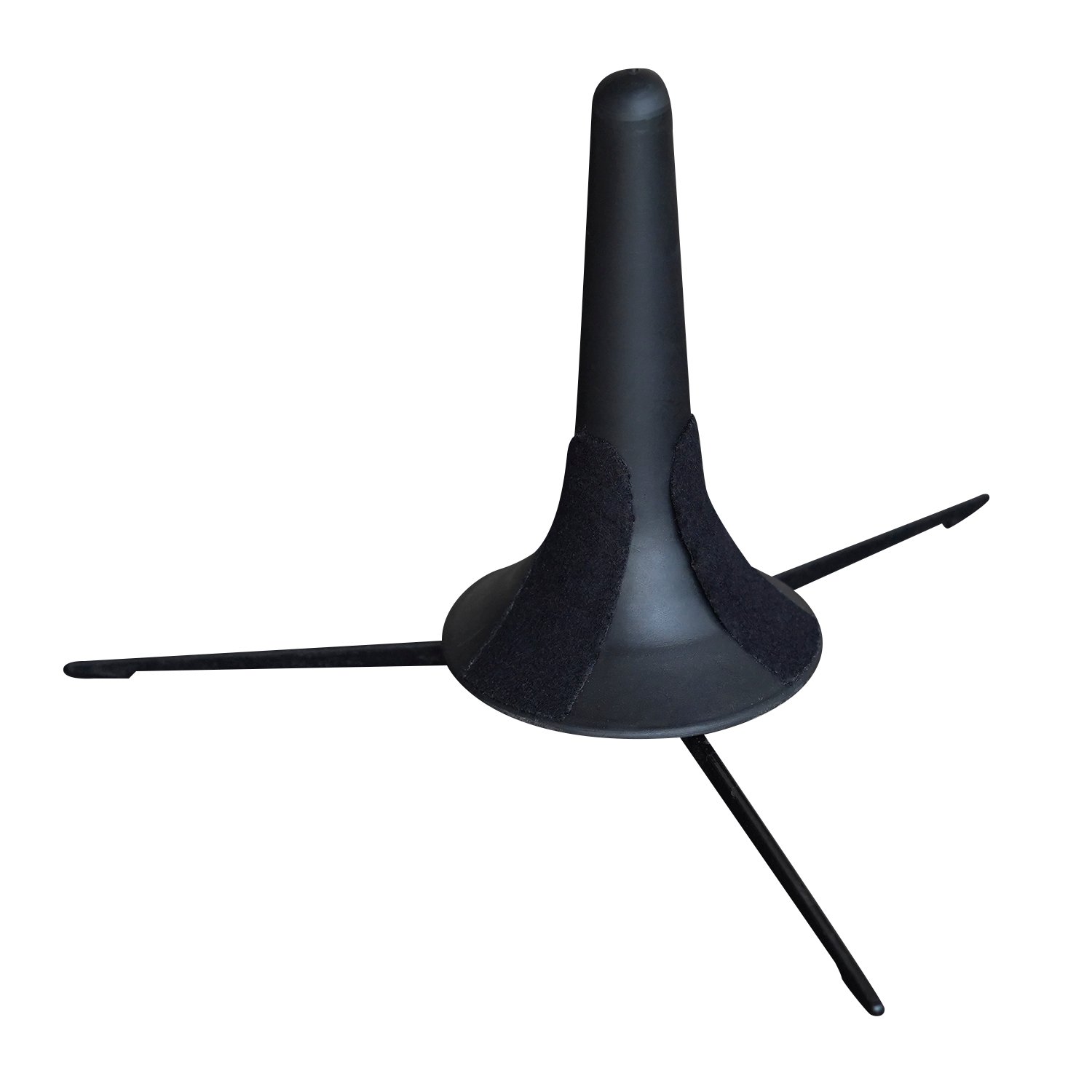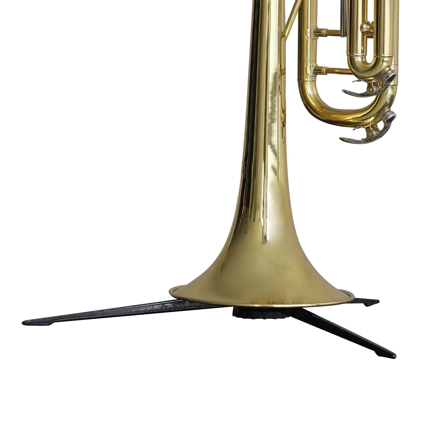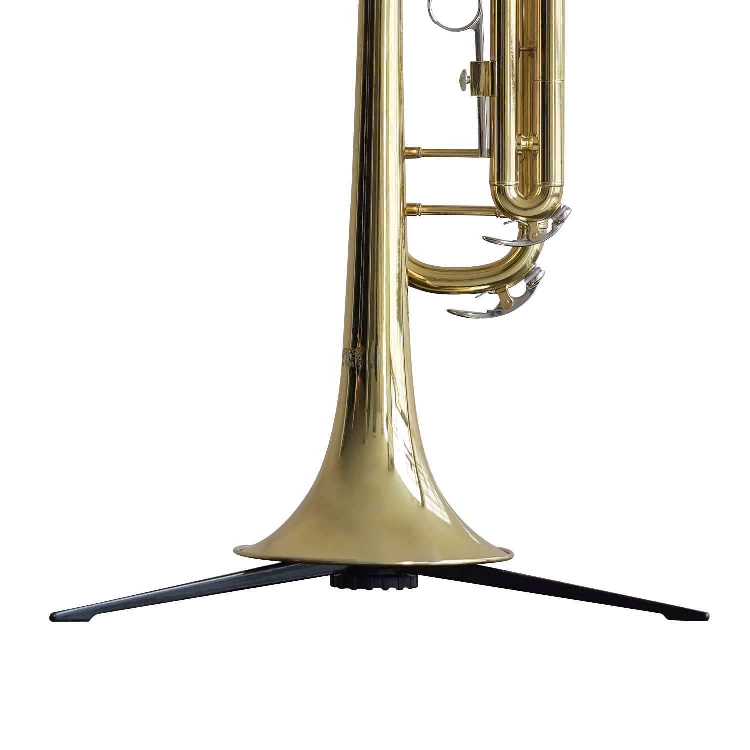 El soporte central se inserta suavemente en la campana de la trompeta, brindando estabilidad sin dañar el instrumento, mientras que su base asegura un apoyo firme durante ensayos, prácticas o presentaciones.