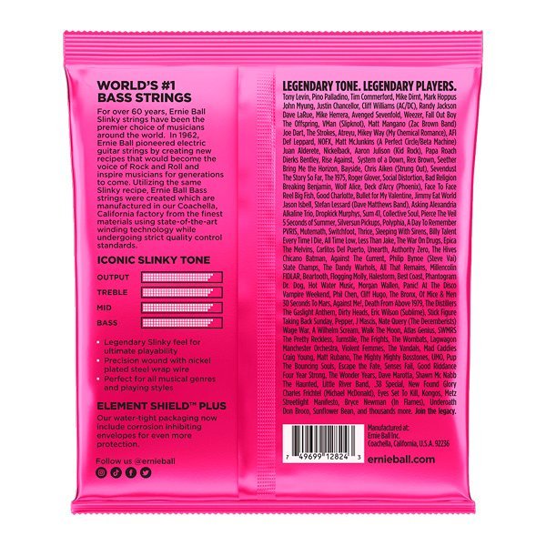 Las cuerdas Ernie Ball Slinky para bajo ofrecen una respuesta brillante y un tono equilibrado. Cada cuerda se fabrica minuciosamente con materiales de alta calidad en la factoría de Coachella Valley, en el sur de California. La lista de endorsers de las cuerdas Slinky, nos da una idea de su rendimiento. Cuerdas .040, .060, .075, .095 .125