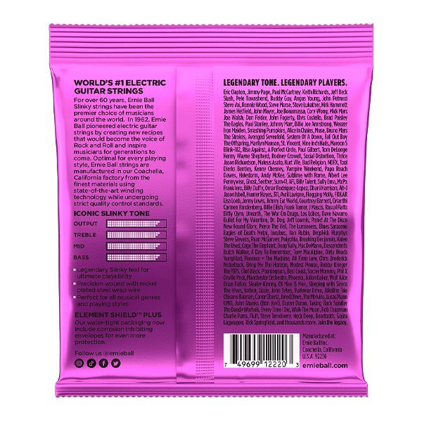 Las cuerdas Ernie Ball Power Slinky son una elección perfecta para aquellos a quienes les gustan los ritmos pesados en el rock and roll o blues. Las Power Slinkys han sido durante mucho tiempo las favoritas de Slash, Metallica y Kenny Wayne Shepherd debido a la combinación de calibres más gruesos que proporcionan un tono ligeramente más potente. Todas las cuerdas de Ernie Ball están fabricadas con precisión, usando los más altos estándares de calidad y las especificaciones más exigentes para asegurar consistencia, rendimiento óptimo y larga vida útil. Las Power Slinky están fabricadas con un alambre de acero niquelado que envuelve el núcleo central hexagonal mientras que las planas se fabrican de acero de alto carbono estañado especialmente templado para ofrecer un sonido muy equilibrado a tu guitarra. Calibres .011, .014, .018p, .028, .038, .048