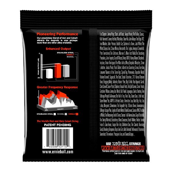 Diseñadas para ofrecer la máxima salida y claridad, las Ernie Ball Cobalt Slinky incorporan los últimos avances tecnológicos. El cobalto se caracteriza por ofrecer un amplio rango dinámico, unos harmónicos increíbles, graves envolventes y agudos muy claros. El cobalto también ofrece un magnetismo específico que favorece la relación tonal entre las pastillas de la guitarra y las cuerdas. Las Cobalt Slinky son además muy agradables al tacto. Resulta muy sencillo hacer bendings con ellas. Calibres .010, .013, .017, .030, .042, .052