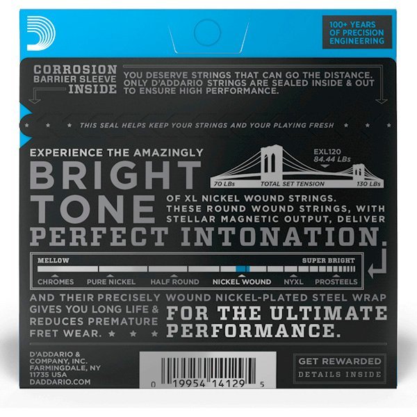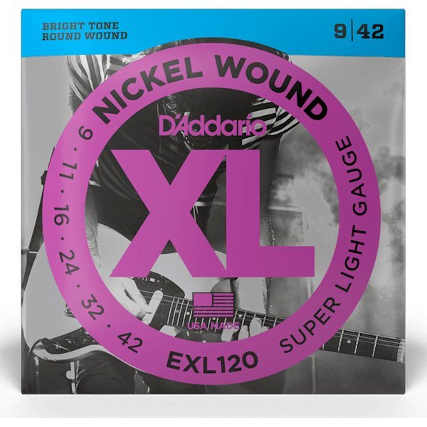 - EXL120 es un juego de calibre súper ligero con máxima flexibilidad y tono penetrante. Las cuerdas de guitarra eléctrica XL Nickel Wound, reconocidas durante mucho tiempo como el estándar de la industria, son ideales para una amplia gama de estilos musicales.