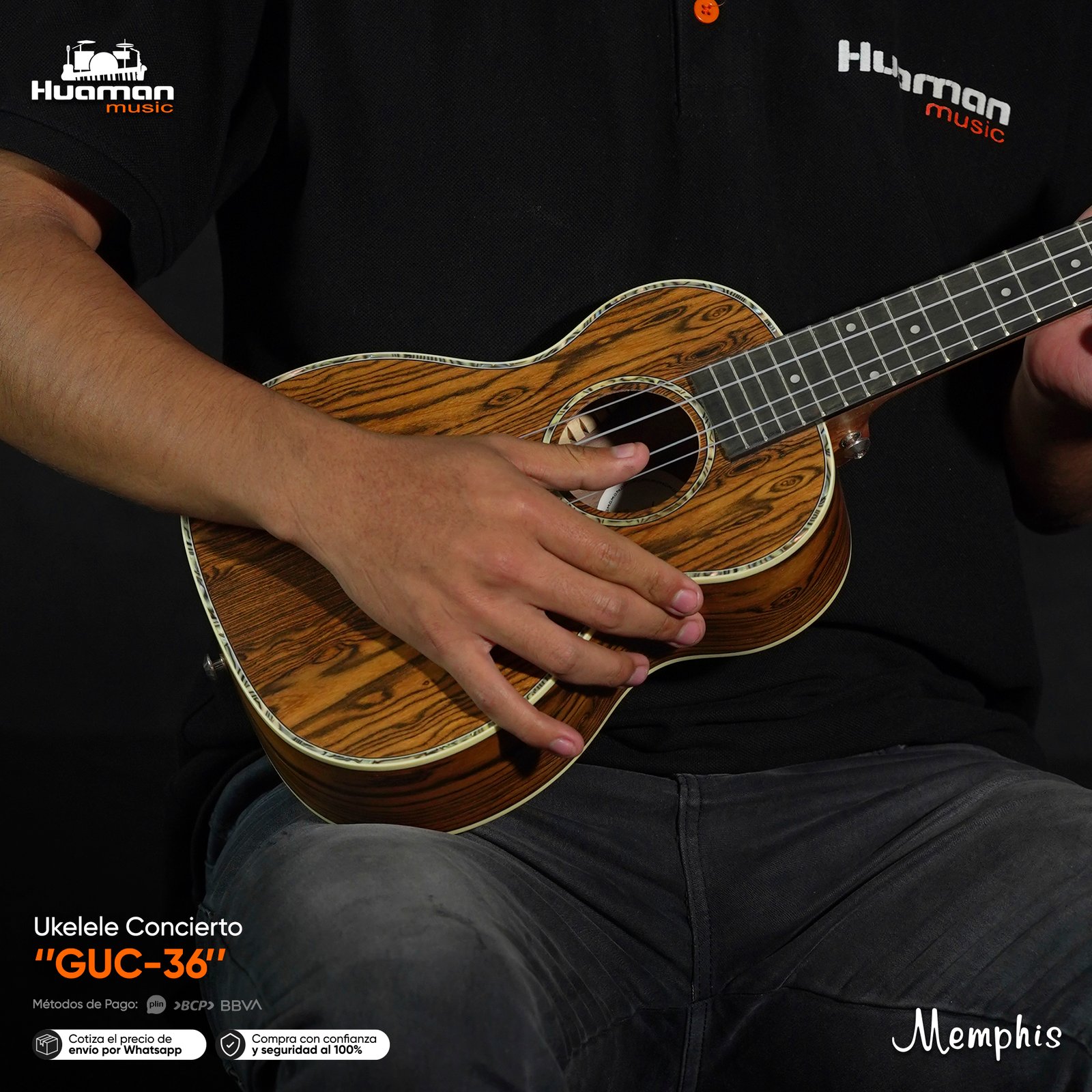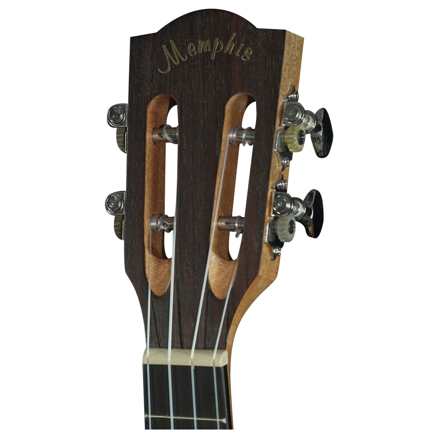 El Ukulele Concierto Memphis está construido íntegramente en madera de okume, lo que le otorga un tono cálido, balanceado y con gran proyección. Su diseño combina simplicidad y elegancia, convirtiéndolo en un instrumento confiable tanto para quienes están aprendiendo como para músicos que buscan un ukulele versátil y de sonido auténtico.